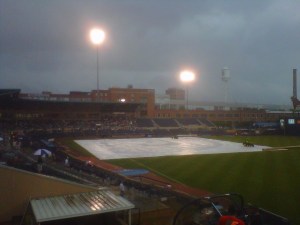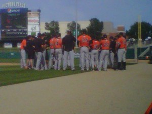 Across the street from where the motorcyclists convene, there’s a gathering of Triple-A baseball teams at Victory Field. The Norfolk Tides are beginning pre-game preparations, as they re-pay a visit to the home-standing Indians. Two weeks ago in Norfolk, the Tides rebounded from two Indians’ wins with two of their own, before leaving town. They’ve since been to Durham and Louisville. Day One in Indy is Day Seven of this trip.