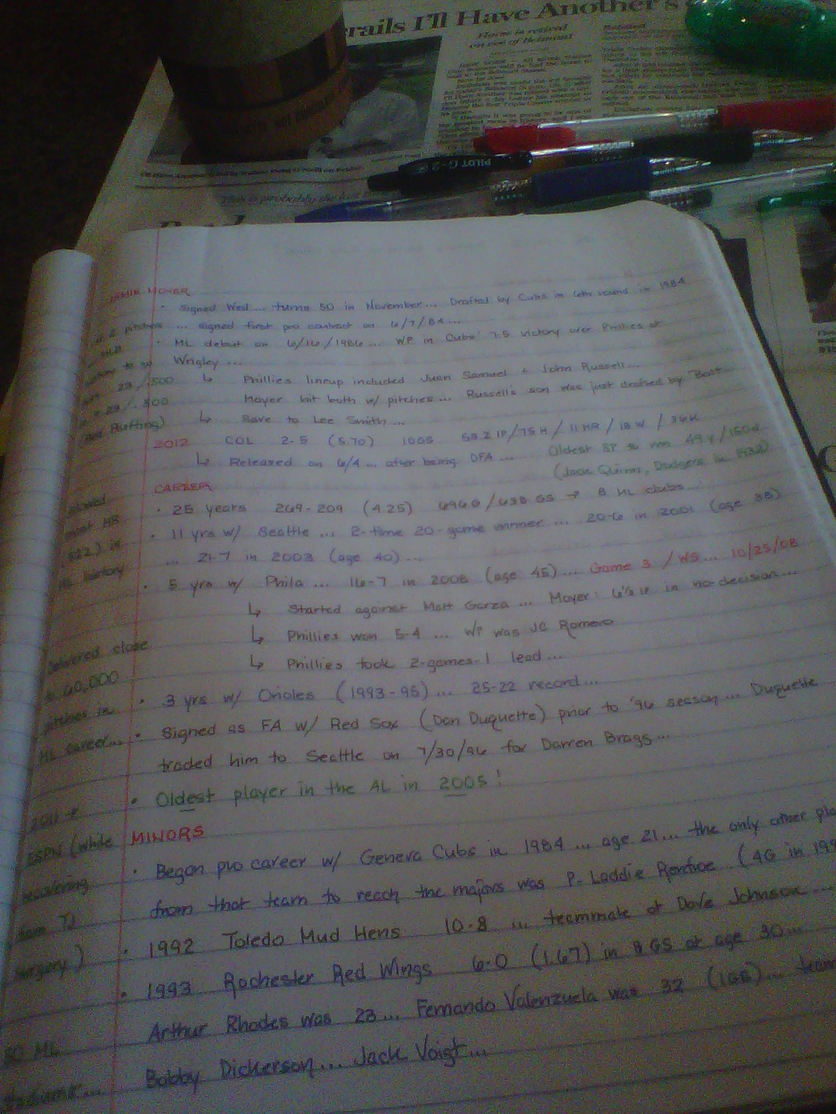 Moyer and Mejia each pitches in June 2012, little more than a year after undergoing Tommy John reconstructive surgery. But tonight the soft-tossing lefty refusing to yield to the end of the road got the better of the hard-throwing righthander still just starting out on his career path.