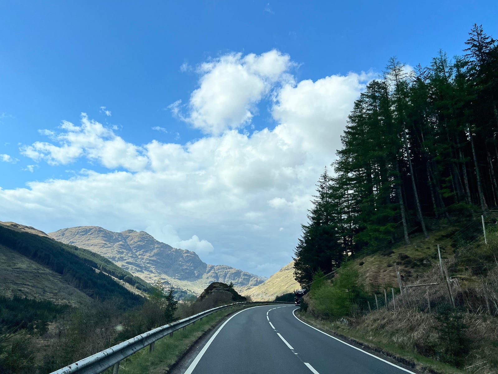 From the passenger’s seat, the one on the left, while driving toward Loch Restil in Scotland.